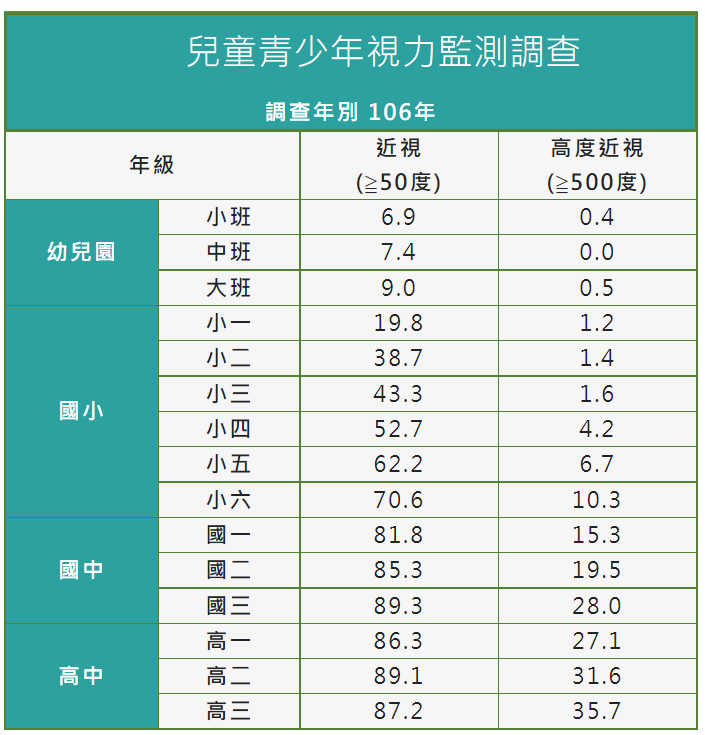 我國學童近視問題日益嚴重,依據國民健康署委託台大醫院團隊以散瞳驗光方式於106年執行之「兒童青少年視力監測調查」結果,與上一次99年調查資料比較,國小各年級均上升,尤其小二從28.3%上升到38.7%、小六則從62%上升到70.6%、而國三已達89.3%;在高度近視比率(度數>500)方面,小六10.3%、國三28.0%、高三已達35.7%。國民健康署署長王英偉對我國高度近視問題感到憂心,因高度近視容易產生早年性白內障、青光眼、視網膜剝離及黃斑病變,甚至有10%會導致失明。呼籲家長要重視近視是疾病、以及視力存摺的觀念,在課餘時間鼓勵學童要多戶外活動,每年至少1次視力檢查,已近視者須控制近視度數,從小就要愛護眼睛。